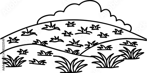 Hilly countryside landscape with grass, shrubs, and cloud outline natural meadow terrain scenery illustration