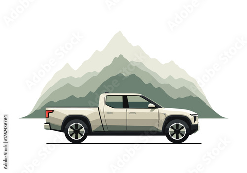 A pixelated pickup truck is parked against a backdrop of layered mountain ranges