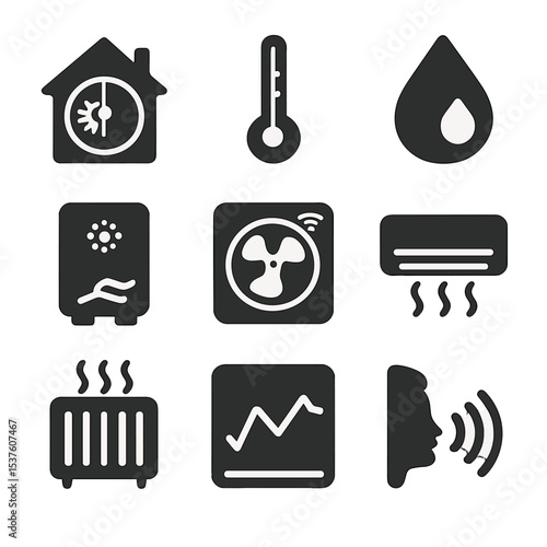 Home heating and air circulation icons depicting comfort and health in indoor environments