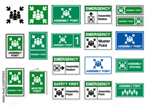 Emergency evacuation assembly point sign bundle, safety gathering point signboard, vector illustration.