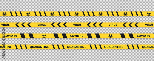 Seamless yellow and black warning tapes. Quarantine, stop, covid-19, border closed, do not cross, sign coronavirus.