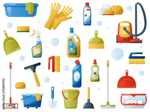 Set of cleaning supplies including detergent bottles, gloves, brushes, sponges and mop. Vector illustration of housework items. Cleaning tools concept. Elements are isolated on white background.