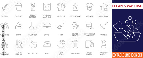 Cleaning icon. Cleaning and Household Supplies line icons set. Editable stroke.