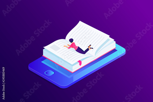 Isometric concept for Digital Reading, E-classroom Textbook, Modern Education, E-learning, Online Training and Course, Audio Tutorial, Distance Education, Ebook and Students
