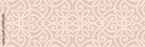Banner, vintage cover design, wallpaper. Geometric ethnic pattern on beige background, embossing. 3D relief ornaments, arabesques, mandala, fresco, painting of the East, Asia, India, Mexico, Aztec.