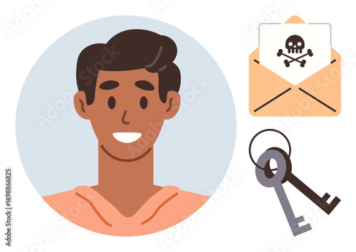 Virus, malware, email fraud, e-mail spam. Email envelope with document and skull and bones and red sign. Concept of virus, piracy, hacking and security. Virus, malware, email fraud, e-mail spam