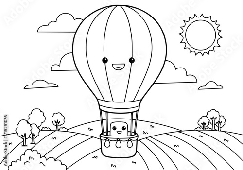 Black and white hot air balloon floating over rolling hills and clouds air travel transportation
