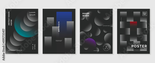 Abstract monochrome gradient poster background vector set. Modern cover template with black and white perspective geometric prism shape, halftone dot. Ideal design for social media, banner, ads.