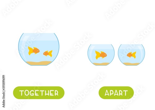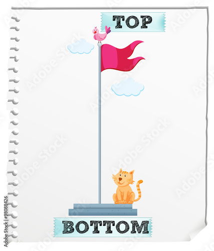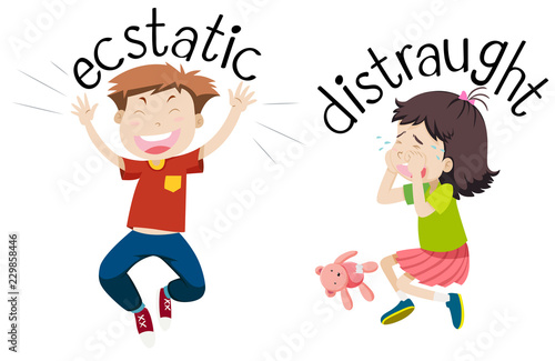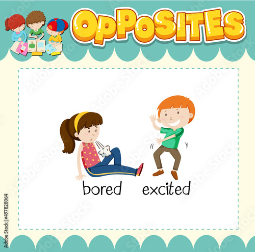 Words order and mess textcard with cartoon characters. Opposite adjectives explanation card. Flat vector illustration, isolated on white background.