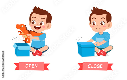 Vector antonyms and opposites. Illustrations on white background. Card for teaching aid, for a foreign language learning. Close and Open.
