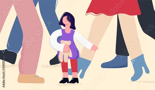 Child girl in adults world vector flat illustration. Cute cartoon kid get lost surrounded by huge human legs isolated on white. Concept of overcoming difficulties, adoption, helpless and loneliness