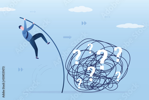 Confident businessman doing pole vaulting cross over crisis valley. Strong man jumping over psychological barrier with pole. Way forward overcoming obstacles or mental problems.
