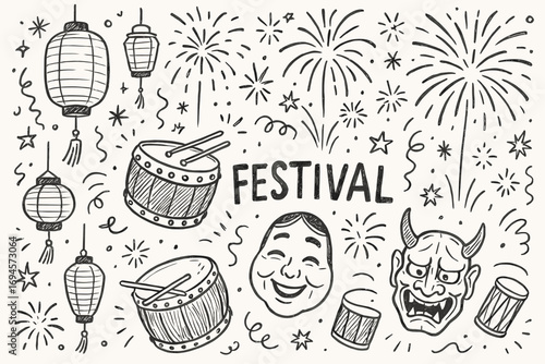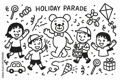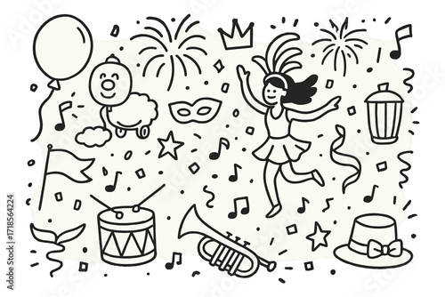 Urban parade doodle art with festive carnival elements. Hand drawn outline for celebration and party design. Ideal for coloring book pages and event invitations