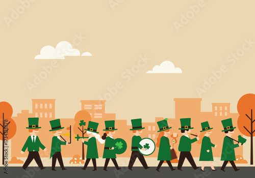 Silhouettes of four figures playing drums and waving ribbons in a celebratory parade like scene | eps vectors