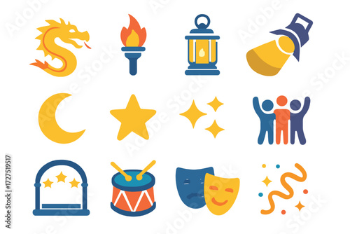 Cultural Parade Icons. Heritage Celebration outline icon set: parade float, traditional outfit, drumline, flower garland, fan, lights.