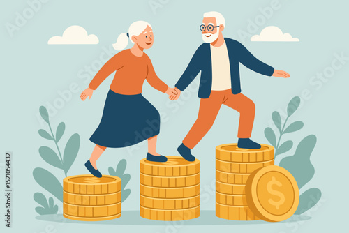 Elderly couple walking up stacks of coins, representing retirement financial planning, pension fund, investment growth, senior wealth management, savings, and future security journey