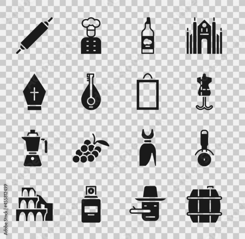 Set Barrel for wine, Pizza knife, Mannequin, Bottle of olive oil, Mandolin, Pope hat, Rolling pin and Picture icon. Vector