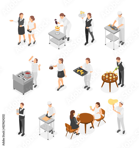 Isometric restaurant team. Chefs preparing meals and cooking, waiter with client and administrator. Pizza maker, friends meet, flawless vector set