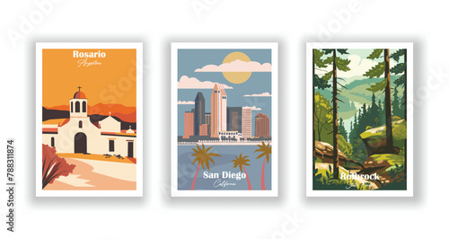 Rosario, Argentina, Rothrock State Forest, San Diego, California - Vintage travel poster. Vector illustration. High quality prints