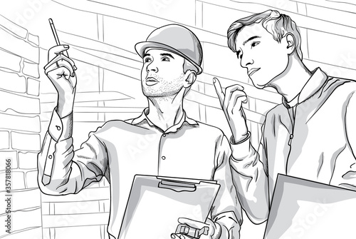 Man with big pencil and women with infomation paper talking about ideas for creating a storyboard on white background, story, storyboard, idea, concept, Vector illustration design