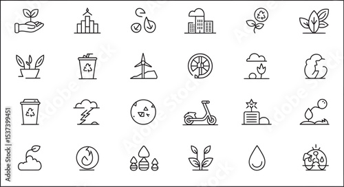 Collection of line art icons depicting sustainability and environmental awareness concepts