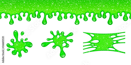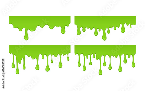 Green slime. Toxic mucus. Bright blots and smudges or dripping streams. Spooky sticky stretch texture. Different shapes of radioactive substance. Creepy flowing borders templates, vector acidic set