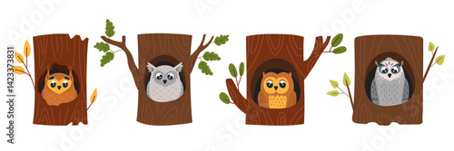 Cartoon owls in tree hollows. Wild forest owl birds sitting in woods house, wildlife birds oak nests flat vector illustration set. Owls hollows collection