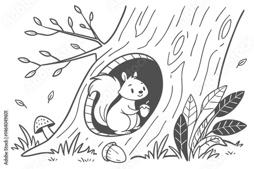83 Black and white illustration, cute squirrel, tree hollow, detailed tree bark, acorns, grass, twigs, woodland scene, children's book style, line art, whimsical, cozy, nature, forest habitat, simple