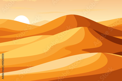 Vector illustration of a hot desert landscape with sand dunes and a setting sun