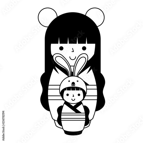 Japanese kokeshi dolls character icon vector illustration. Kawai asian girls wearing kimono. Cute cartoon asian women.