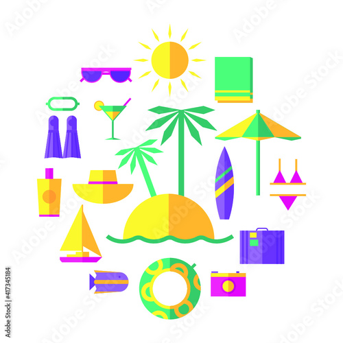 Summer set - sun umbrella, swimsuit, sunglasses, swimming circle, woman using sunscreen, surfboard, camera. Concept of recreation at sea, beach tourism. Cartoon colored vector illustrations group.