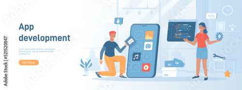 App development. Create and optimize layouts interfaces for mobile applications. Flat concept great for social media promotional material. Website banner on white background.