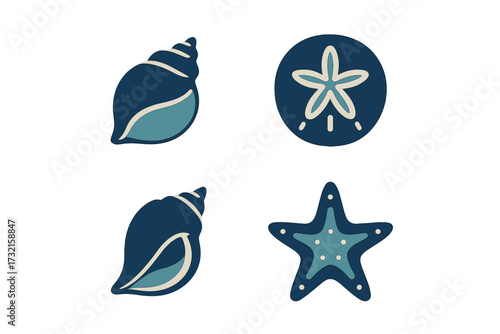 Set of stylized blue layered sea shells and starfish collection with ocean marine life elements and underwater creatures in paper cut style