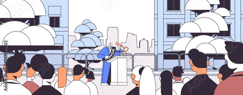 Politic candidate rally during presidential election campaign. Vector illustration of a president or prime minister giving speech and supporters giving supports to their political party.