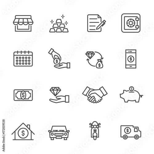 Pawn Loan icon collection set. Item Pledge, Cash Offer, Loan Renewal, Loan Ticket, Gold Appraisal, business icon. Simple line vector