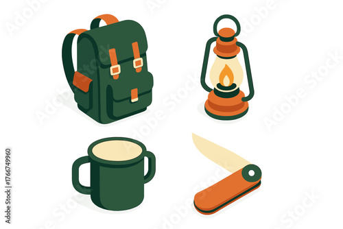 Isometric set of camping gear icons featuring backpack lantern mug and pocket knife