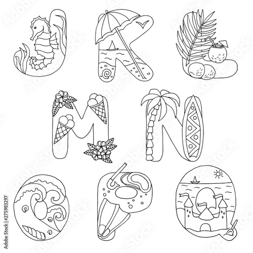Tropical Animals Coloring. Animals under the palms children?s coloring book illustration, outlined drawing, a monkey, bird, and crab resting near two palm