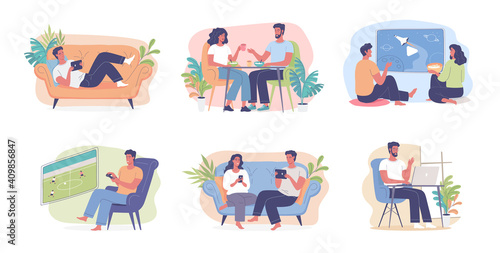 Evening family time. Hygge concept. Flat couple vector illustration. Young man and woman reading in living room. Woman and man read book in rest time