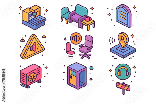 Serene Sleep Icons. Peaceful rest flat icons: bed, pillow, blanket, sleeping face, moon, cloud, hammock, starry night, calm waves, open window, feather, nightcap.