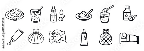 Home Rest set icon. Contains home rest illustrations such as taking bath, deep sleep, cozy room and more.