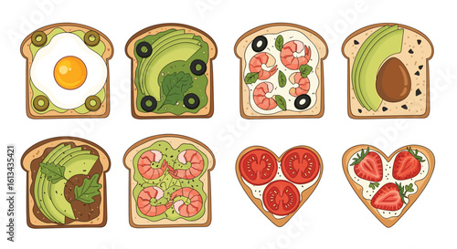 Healthy toasts with vegetables and fish cartoon illustration set. Slices of bread with salmon, tomato, eggs, mushrooms, avocado isolated on white background. Food, sandwich, breakfast concept