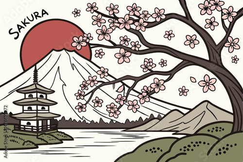 Japanese cherry blossom sakura on the background of an old asian style house. vector simple illustration