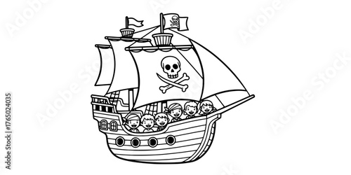 Simple Pirate Ship and Diverse Crew Outline Coloring Vector