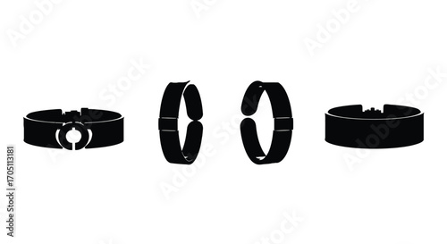 Set of four sleek black metal rings in different poses and styles isolated vector
