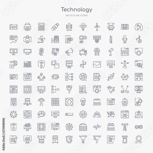 100 technology outline icons set such as colory theory, content marketing, conversion, conversion rate optimization, css3, data architecture, data modelling, data visualization