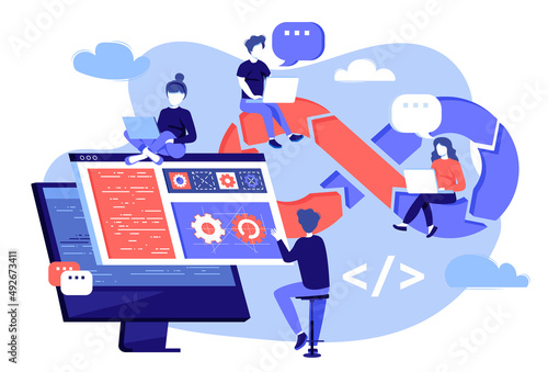 DevOps concept isolated. Software development in team, processes organization. People scene in flat cartoon design. Vector illustration for blogging, website, mobile app, promotional materials.