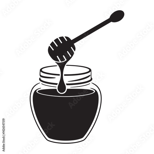 Honey Bee Icons Set. Honey Jar, Bee, Honeycomb, Beehive, Honey Dripper. Sweet Natural Honey Harvest. Black Silhouette Vector. Apiary, Beekeeping, Organic Product, Insect, Nature, Food Symbol