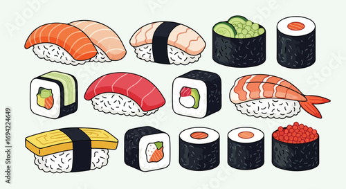 apanese cuisine, sushi, eel rice, ramen, seaweed rice, fried shrimp, kebabs, salmon, caviar, etc., with cartoon hand-drawn vector illustrations
