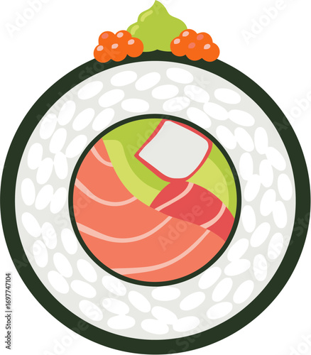 Cute sushi roll with salmon and caviar illustration for food lovers.
