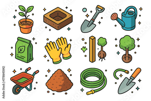 A set of four simple black glyph icons for gardening, featuring a pile of soil, a watering can, a potted plant, and a shovel